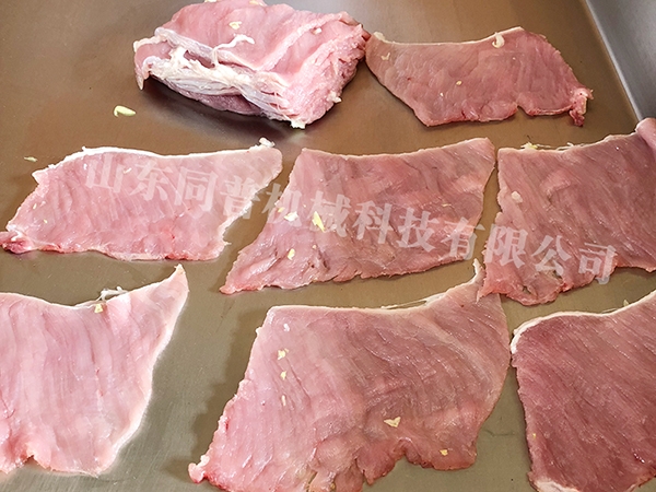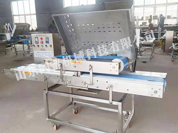 輸送帶條紋狀,清洗方便,厚度2mm,可切出均勻的薄肉片,在-20度的條件下,皮帶也是正常使用。刀片采用進口材質,韌性好,硬度高,使用壽命長,在高頻運動工作過程中不會斷裂,降低產品的成本