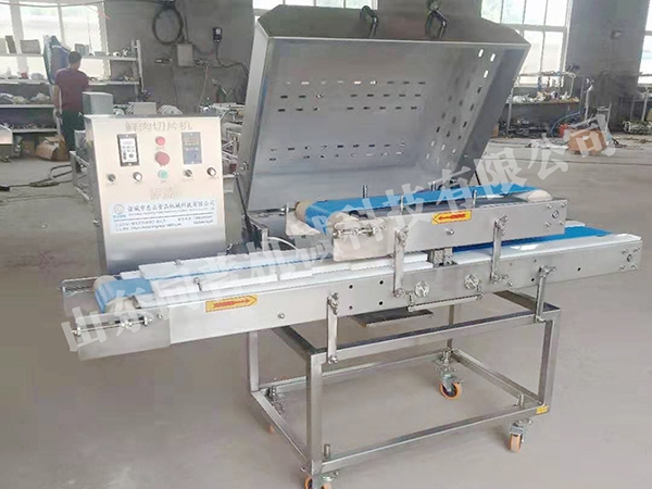 本設備是專業用于鮮品或者熟品的無骨雞胸、鴨胸、牛肉、豬肉切片熟對肉的橫向(水平)整肉一次性多片切割,也就是把一塊完整的肉放在機器的輸送帶上,輸送帶傳送過去后這塊雞胸肉就完全切好了。適合加工里脊肉片,雪花雞柳,無骨雞柳等產品的切片,配上我公司生產的切條機更省工,省力,提高產量。