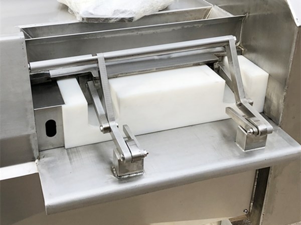 切丁機是肉類制品生產制作工藝中的一個重要設備。將肉塊,脂肪,蔬菜類等主要原料,切割成用戶所需要的片,條,塊等形狀,調整刀柵的間隔尺寸可切出不同尺寸的產品。產品長度尺寸的大小由推進速度旋鈕來調節。