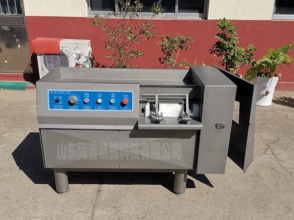 切丁機是肉類制品生產制作工藝中的一個重要設備。將肉塊,脂肪,蔬菜類等主要原料,切割成用戶所需要的片,條,塊等形狀,調整刀柵的間隔尺寸可切出不同尺寸的產品。產品長度尺寸的大小由推進速度旋鈕來調節。