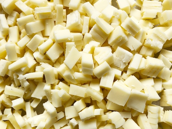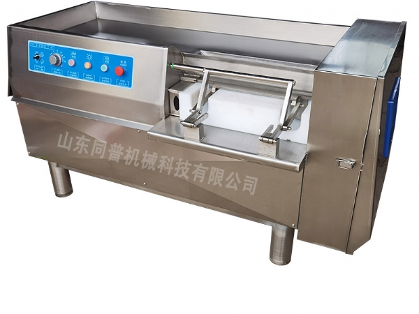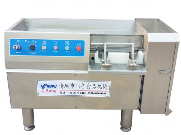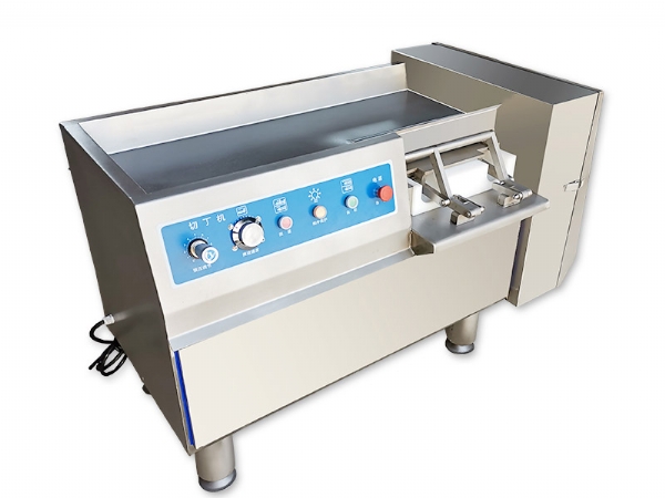 切丁機是肉類制品生產制作工藝中的一個重要設備。將肉塊,脂肪,蔬菜類等主要原料,切割成用戶所需要的片,條,塊等形狀,調整間隔尺寸可切出不同尺寸的產品。產品長度尺寸的大小由推進速度旋鈕來調節。